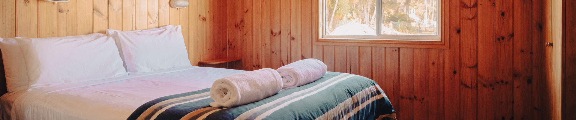 - Two bedroom cabin – 1x Queen Bed, 1x Double.